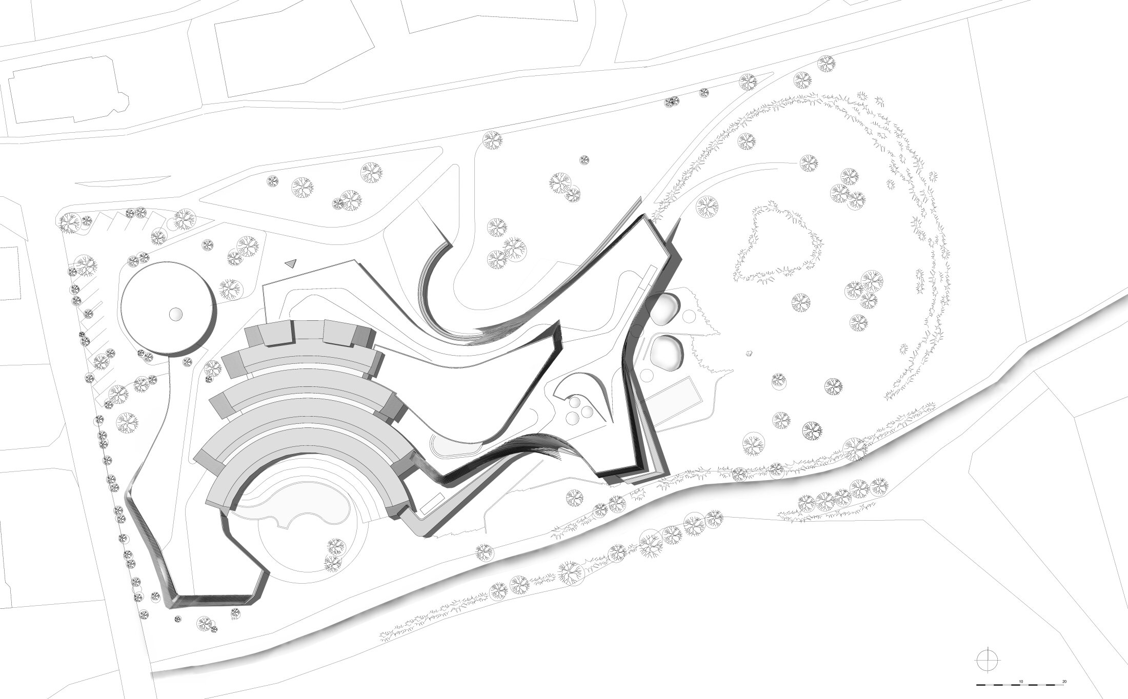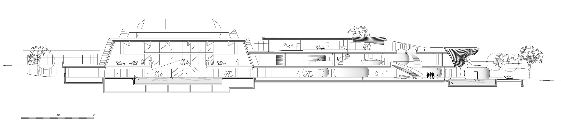 On all three floors, the northern side houses the service areas—changing rooms, ancillary spaces, the sauna supervisor’s room, technical facilities, solaria, and beauty and massage rooms—while to the south, an open landscaped area oriented toward the stream and mountains unfolds, where the various sauna and wellness facilities seem freely scattered across the terrain.