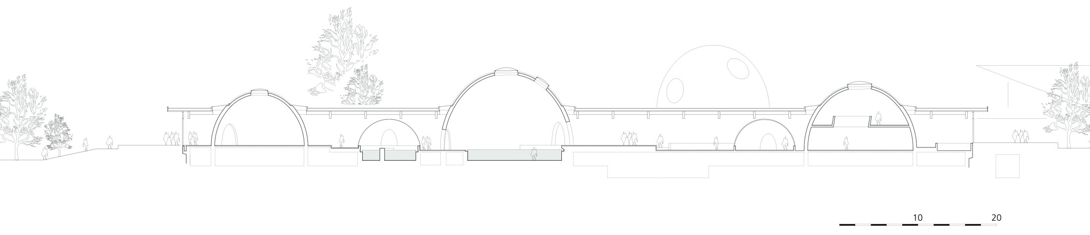 Each dome, conceived as a mostly opaque volume punctuated by circular openings, has its own identity shaped by varying natural and artificial light, materials, water features, and acoustics. The climate concept capitalizes on the spatial separation between the domes, hall, restaurant, and lounging areas to optimize comfort and energy efficiency. By supplying air to the hall and extracting it from the domes—where water surfaces and humidity are concentrated—the design creates a warm, humid climate inside the domes and a cooler, drier one in the hall. The glazed hall also functions as a solar-heated winter garden.