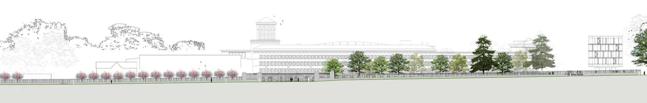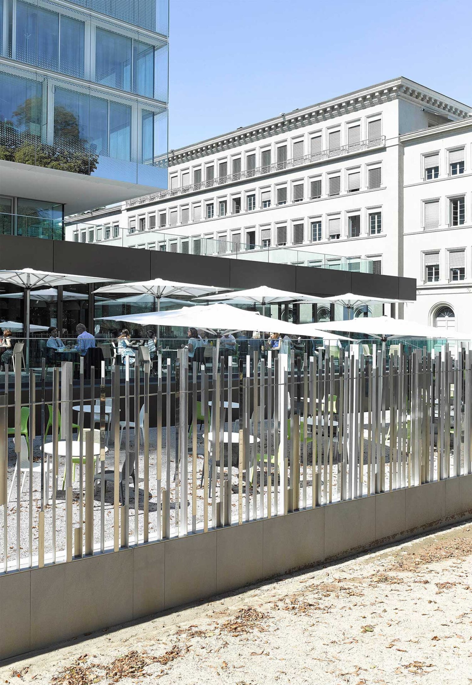 The design deliberately minimizes the perception of a defensive boundary in Geneva, Switzerland. Anti-climb protection and technical security features are integrated in such a way that they remain visually unobtrusive. Instead of emphasizing separation, the perimeter maintains visual continuity and permeability while ensuring controlled access and robust protection. Along the lakeside in Geneva, Switzerland, the security line transforms into a raised terrace that establishes a new base for the existing buildings and opens views toward Lake Geneva. This element, reminiscent of a landscape feature known as a ha-ha, secures access without interrupting the visual connection to the water. At the same time, it creates a distinct outdoor space for employees and defines the previously unclear boundary of the campus with a clear spatial identity.