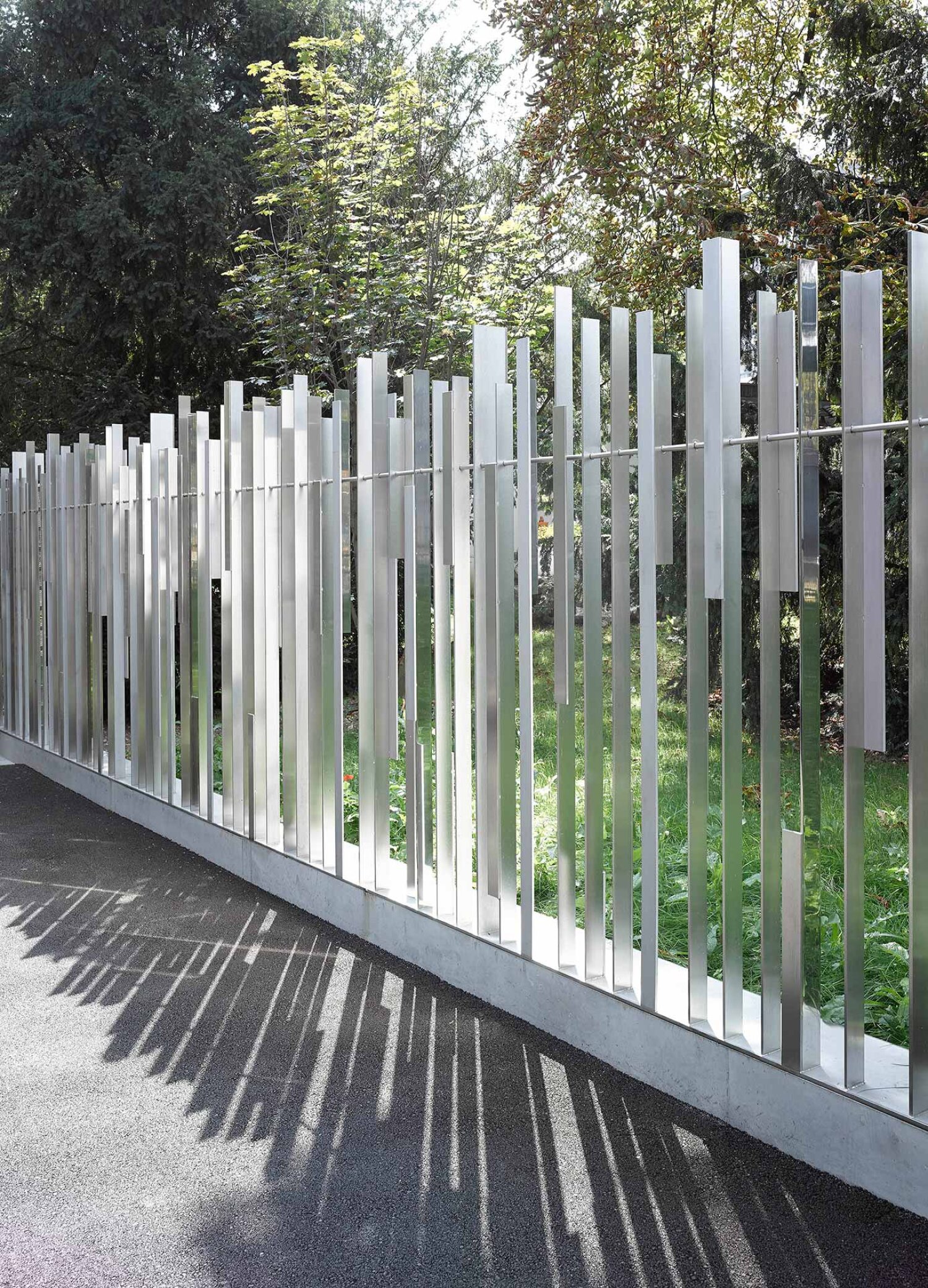 Rather than treating security as an added layer, the design integrates it as an inherent part of the architectural and landscape concept in Geneva, Switzerland. The perimeter is conceived as a continuous structure that moves through different spatial conditions. In wooded areas it appears as a slender fence that weaves between trees, while across open meadows and orchards it adopts a more linear expression. Constructed from steel elements with varying spacing and surface treatments, it responds to the specific character of each surrounding landscape. Its soft, fabric-like appearance allows it to dissolve into its environment and act as a visual filter between interior and exterior.